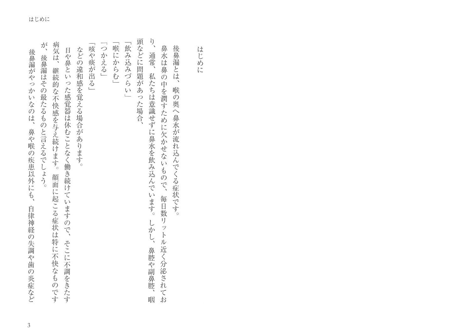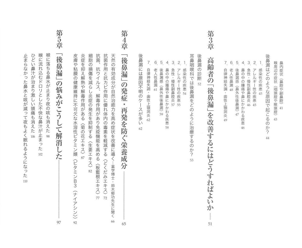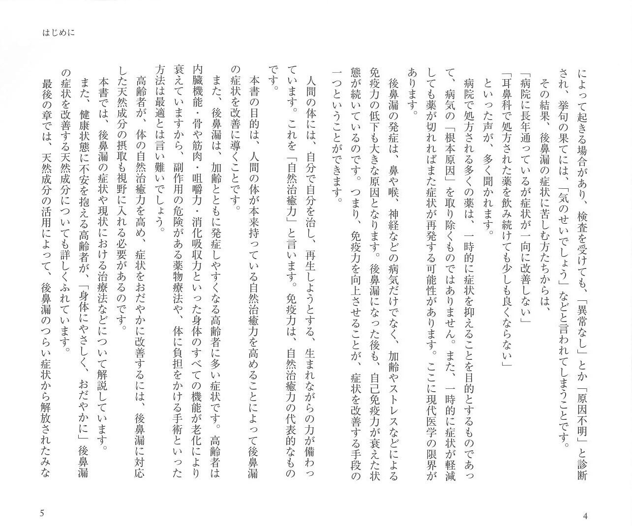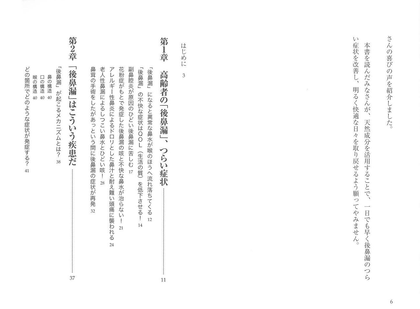 それでは、後鼻漏の緩和、改善を図るにはどうすればよいのか?本書では、後鼻漏の症状や現状における治療法について解説しています。また、「身体にやさしく、おだやかに」後鼻漏の症状を緩和する天然成分を紹介、天然成分の活用によって、後鼻漏のつらい症状から解放された方々の声も収録しています。